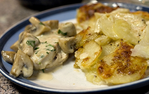 Kepsnelius apliekite padažu ir patiekite su pievagrybiais, bulvių koše bei salierais.