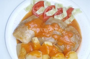 6. Apkepinti balandėliai sudedami į puodą, užpilami skysčiu, kur virė kopūstas, ir sultiniu (užpilami, kad vos apsemtų).