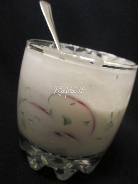 Kelis ridikėlius įmesti ant stiklines dugno, supilti brinzą su jogurtu, pabarstyti svogūno laiškais ir papuošti ridikėlių griežinėliais.
