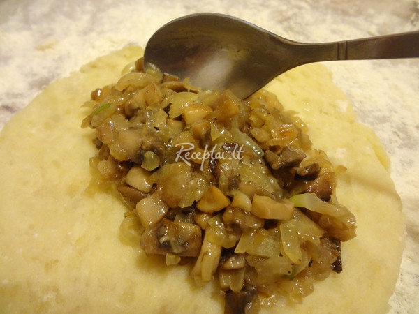 Nuplauname ir smulkiai supjaustome grybus. Kepiname įkaitintame aliejuje, kol išgaruos skystis nuo grybų. Tada dedame smulkintą svogūną ir kepiname 5 - 7 minutes iki auksinės rudos spalvos.