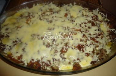 3. Į skardą sudėti bulvių sluoksnį, mėsos, bulvės ir vėl dėti mėsą (pasluoksniuoti). Supilti padažą ant viršaus.