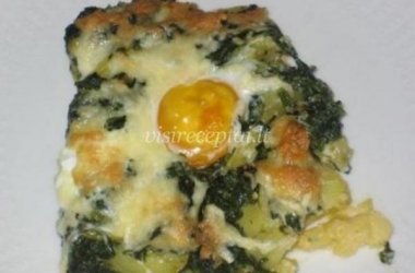 Susmulkintus špinatus sumaišome su sugrūstu česnaku, grietine ir prieskoniais. Visą šią masę patroškiname keptuvėje apie 5 minutes ir sudedame ant bulvių.