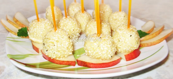 Sūrį supjaustyti ir kartu su majonezu išmaišyti virtuviniu kombainu. Iš masės formuoti kamuoliukus ir juos apvolioti sezamo sėklose. Kriaušę nuplauti ir supjaustyti griežinukais. Ant vėrinuko verti griežinuką kriaušės, sūrio kamuoliuką ir patiekti.