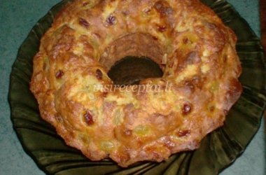 Sudedame supjaustytus obuolius nestambiais gabalėliais, razinas. Galime pagal skonį įpilti kvapų, cinamono ar kakavos. Išmaišome.