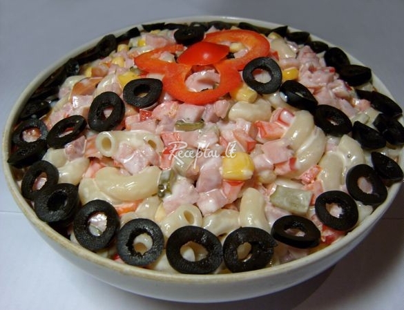 Makaronus išvirti pagal instrukciją ant pakuotės. Atvėsinti. Pridėti pjaustytas daržoves, konservuotus kukurūzus, pagardinti majonezu ir išmaišyti.