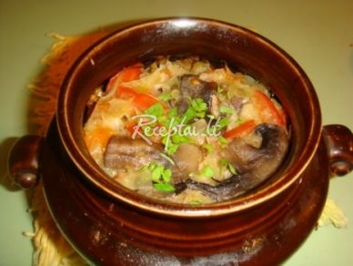 Į molinius indus pilame truputį aliejaus, lygiomis dalimis dedame apkeptus grybus, grietinę, daržoves, vėl dedame grybų. Kepame karštoje orkaitėje apie 40 minučių. Prieš baigiant kepti, viršų pabarstome tarkuotu sūriu, žalumynais (jei norite, kad troškinys būtų sultingesnis ant viršaus, prieš baigiant kepti, galima dėti pjaustytų pomidorų).