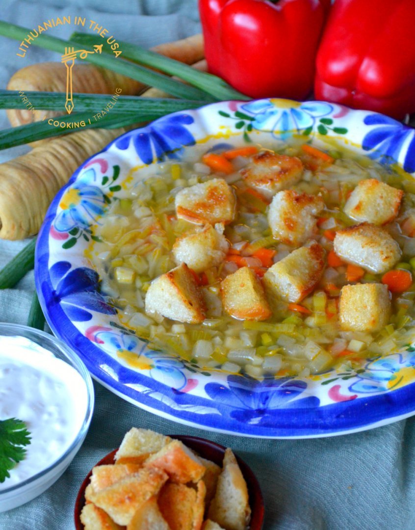 Pabaigoje paragaujame ar reikia papildomai druskos. Sriubą supilstome į dubenėlius, pagardiname skrudinto batono kubeliais. Skanaus!