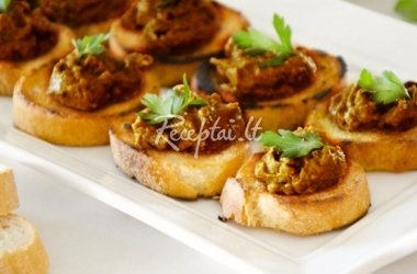 Trintą česnaką sumaišyti su alyvuogių aliejumi. Mišiniu apšlakstyti duonos riekes ir paskrudinti orkaitėje keletą minučių. Ant atvėsusių riekelių tepti baklažanų užtepėlės ir papuošti petražolės šakelėmis.