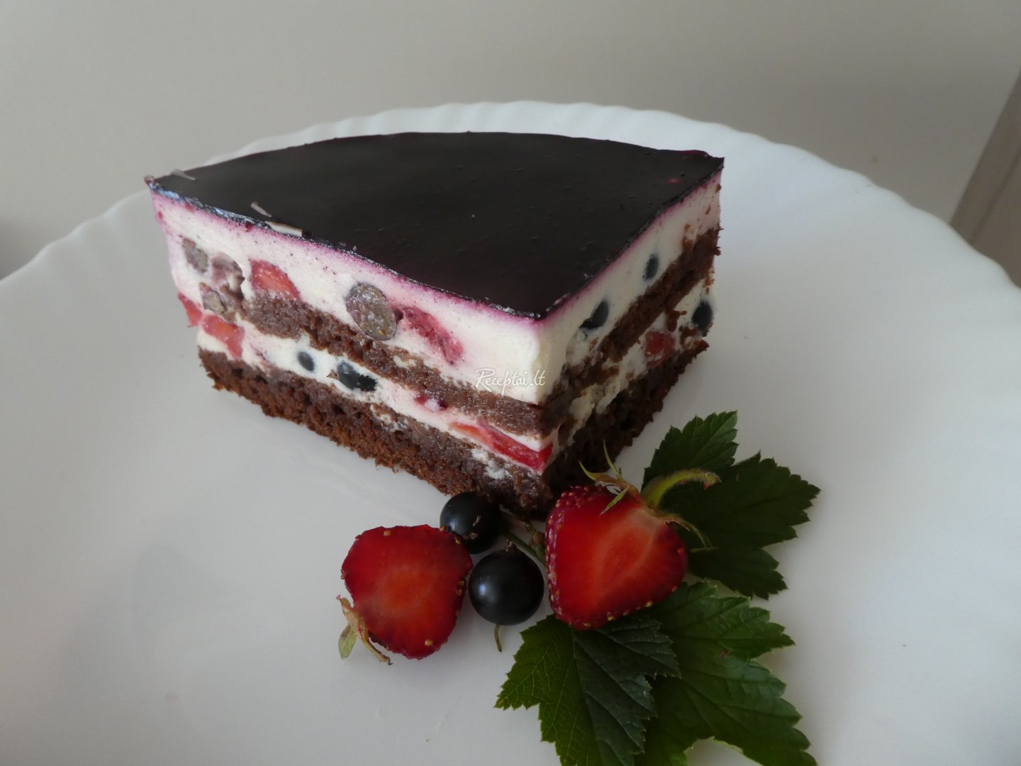 Tortą sluoksniuoti - biskvitas, kremas, apibertas uogų gabaliukais, biskvitas, kremas...Palikti apstingti šaldytuve.