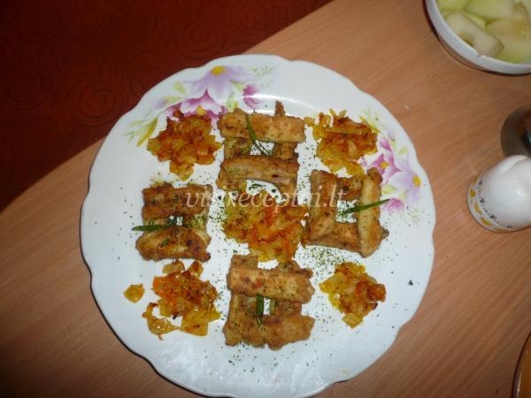 Žuvies filė supjaustome juostelėmis ir sudedame į indą su plaktais kiaušiniais, prieskoniais, druska. Palaikome 15-20min. Tada apvoliojame miltuose ir kepame. Žuvytei iškepus, pakepiname smulkintus svogūnus ir tarkuotą, žalią morką. Ant lėkštės formuojame šulinėlius ir vaišiname... Paprasta ir skanu...