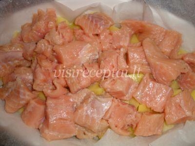 Į skardą sudėkite bulvių griežinėlius, lašišos gabaliukus, pabarstykite prieskoniais, sudėkite sutarkuotus ar pjaustytus kiaušinius, aptepkite grietine ir apibarstykite sutarkuotu sūriu.