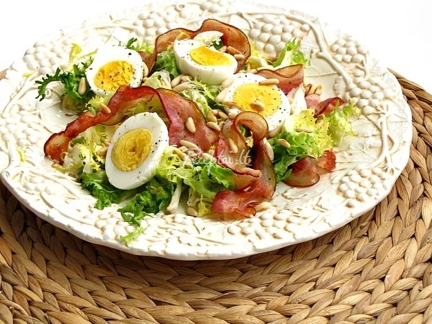 Atskirai apkepkite kedro riešutus.Salotas sudėkite į lėktę, dėkite supjaustytus kiaušinius, šoninę, užberkite kedro riešutus ir apšlakstykite aliejumi.