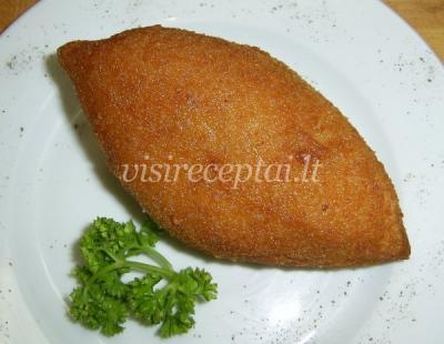Ant filė uždėkite šalto sviesto kubelį (maždaug 3x1x1) ir muštos vištienos likučius. Filė susukite taip, kad sviestas būtų viduryje, o kotleto forma pasidarytų kaip cepelino. Kotletą pasūdykite, pamirkykite plaktame kiaušinyje, apvoliokite džiūvesėliais, vėl pamirkykite kiaušinyje ir vėl apvoliokite džiūvesėliuose. Kotletus virkite aliejuje (fritiūrinėje) apie 4 minutes, vėliau pakepkite 4 min. orkaitėje, kad šiek tiek apsausėtų. Sviestas, kotleto viduje neturi išbėgti.