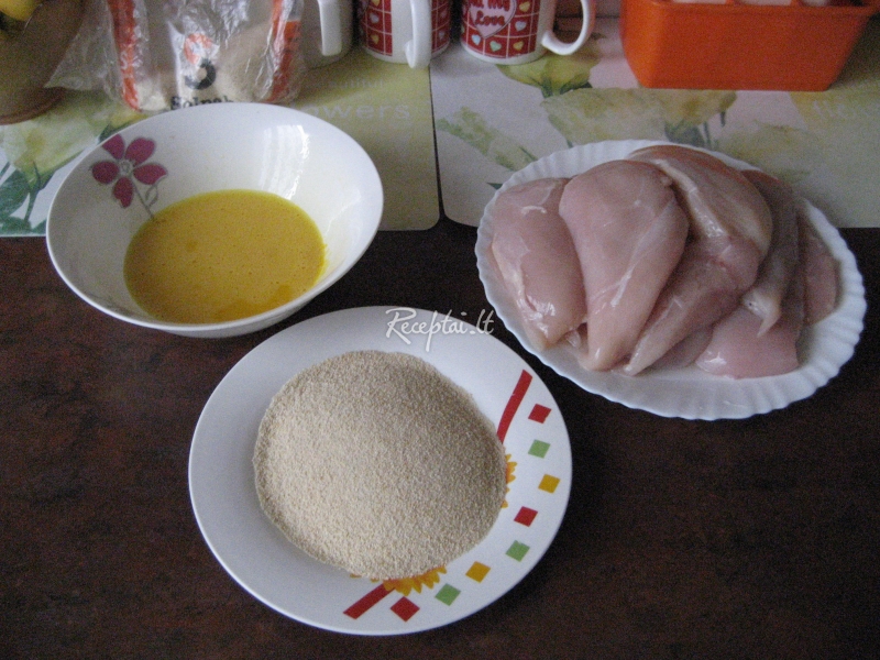 Vištienos filė supjaustyti gabaliukais taip, kad gabalėlio plotas būtų maždaug 12x10 cm. Tuomet gabalėlius išmušti.