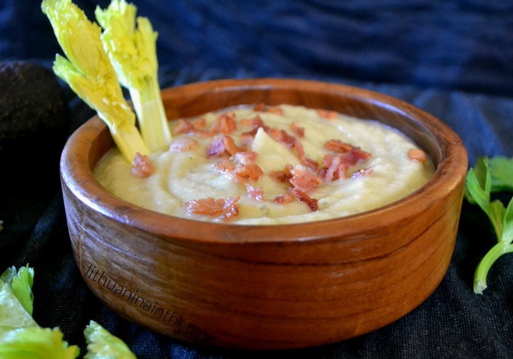 Bulves nulupame, supjaustome nedideliais kubeliais, salierų stiebus supjaustome nedideliais gabalėliais. Bulves ir salierą sudedame į keptuvę su svogūnu ir česnaku, pakepiname ant vidutinės ugnies ~10 min.
