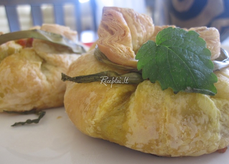 Atšilusią tešlą šie tiek kočiojame, kad gautųsi 9 kvadratėliai. Sudedame įdarą į krepšelius, viską gražiai užlankstome ir aprišame svogūno laišku. Krepšelius sudedame į kepimo popieriumi išklotą skardą ir kepame orkaitėje ~15 min. 180°C temperatūroje, kol tešla šiek tiek paruduos. Iš formų traukti kai pravės.
