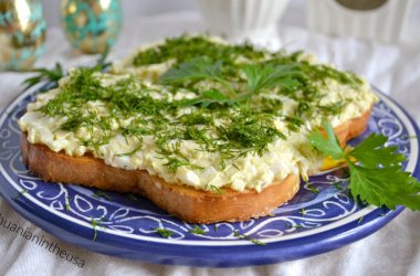 Kiaušinių užtepėlę užtepame ant batono riekių, apibarstome susmulkintais krapais ir skanaujame!