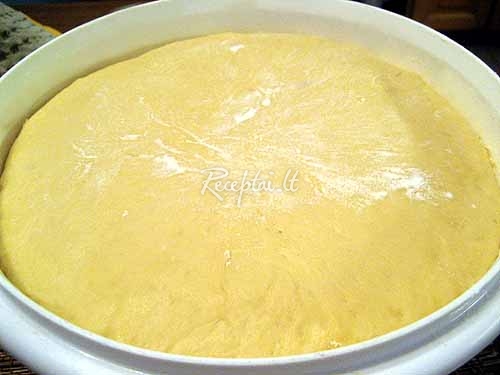 Iškilus tešlai imame sijoti per sietą miltus, maišome rankomis. Jei iškart sudėsite miltus, tešla bus kieta, tad reikia dėti po truputį. Minkyti tol, kol tešla tampa vientisa, ir mažai limpanti prie rankų.(Apie 20 minučių) Perpjovę tešlą turite matyti jog yra susprogusių burbuliukų. Tada kočiojame plonai, dedame cukrų ir cinamoną, ar išbrinkintas aguonas ir kokosų drožles, cukrų. Taip pat galime dėti abrikosus, razinas, datules ir ananasus. Kiekvienam pagal skonį. Galime ir mėsos dėti, daryti kaip kibinus, tik tuomet į tešlą nedėkite cukraus. Visada reikia daryti bandeles mažesnes, nes mielės kepant tikrai daug išpučia :) kepu ~170 temp. jei pyragas storesnis įjungiu kepimą be ventiliatoriaus, jei pyragai ploni, kepu su ventiliatoriumi, kad gražiai apskrustų :). Taip pat prieš dedant kepti, aptepu išplaktu kiaušiniu tam, kad gražiai apskrustų. Vėliau įdėsiu nuotraukų :) Sėkmės!