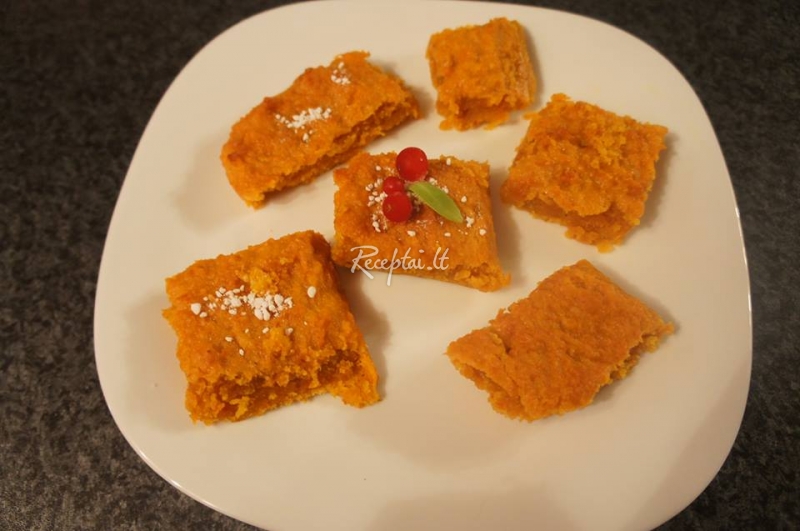 Smulkia tarka sutarkuotas morkas sumaišyti su cukrumi, ir masę palikti valandai, kad cukrus ištirptų. Tada berti miltus, kepimo miltelius, pilti aliejų, išsukti iki vientisos masės, sukrėsti į kepimo popieriumi išklotą skardą ir kepti 40 min. 180°C temp. įkaitintoje orkaitėje. Iškepusį pyragą galima pabarstyti perliniu cukrumi ar pagardinti grietinėle, ledais. Papuošiau spanguolėmis ir citrinžolės lapeliu.