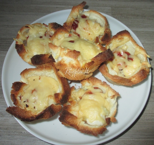 Nupjauti baltos duonos riekelių plutelę. Iš riekelių su apvaliu puodeliu ar stikline išspausti apskritimą. Riekeles iškočioti ir jomis iškloti keksiukų formeles.