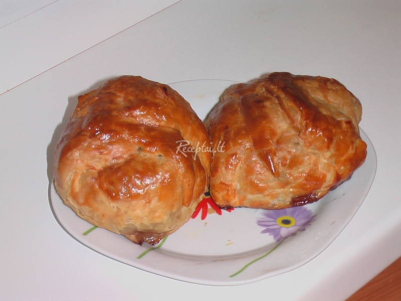 Paruoštus pyragėlius dėkite į kepimo skardą ir kepkite įkaitintoje iki 210° C temperatūros orkaitėje apie 25 minutes, kol pyragėliai gražiai pagels.