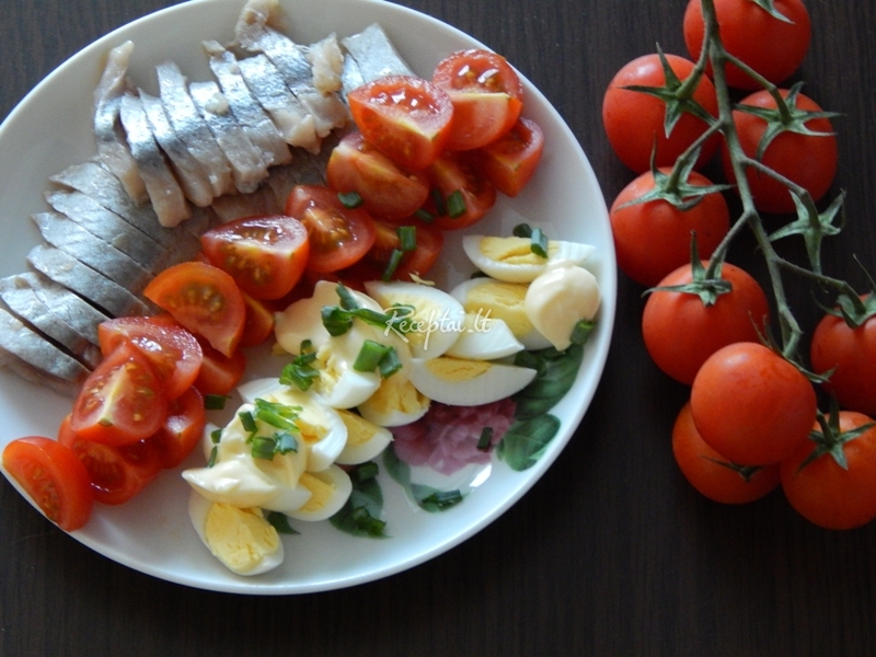 Putpeles kiaušinius išverdame apie 3 min virti. Silke susipjaustyti vieno kąsnio dydžio gabaliukais, pomidorus taip pat, susmulkinti svogūnu laiškus. Kiaušinius nulupti ir supjaustyti. Viską sudėti į lėkštę ir ant kiaušiniu uždėti DAUMANTŲ majonezas „MangoMajo“ . ir apibarstyti svogūnų laiškais.