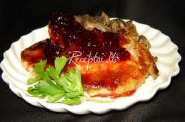 Kiaulienos gabalėlius pabarstome prieskoniais, druska, žolelėmis. Apkepame keptuvėje iš abiejų pusių. Į likusį aliejų keptuvėje įpilam 4 šaukštus raudono vyno, išmaišome. Iš obuolių išimame sėklas, nulupame ir perpjauname pusiau. Į puodą įpilame vandens,tiek kad obuolių puseles apsemtų iki pusės. Užverdame, įberiame šaukštą cukraus, dedame obuolio pusę ir kiekvieną puselę po 2 minutes paverdame. Į obuolio puselę, kur buvo sėklidės, dedame šaukštelį spanguolių džemo. Į lėkštę dedame porą kepsnelių, per vidurį obuoliuką, šone pilame vyno padažą. Valgome su ryžiais.