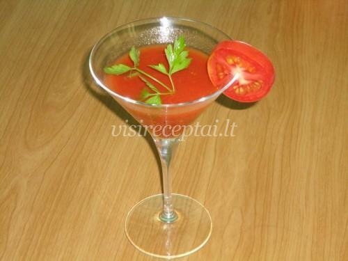 I pomidorų sulčių stiklinę įspauskite skiltelę česnako (galima ir daugiau, pagal kiekvieno skonį), įberkite žiupsnelį druskos ir pipirų, taip pat galima įsidėti grietinės (1 šaukštelis, arba pagal skonį, jei mėgstate). Viską gerai išmaišykite.