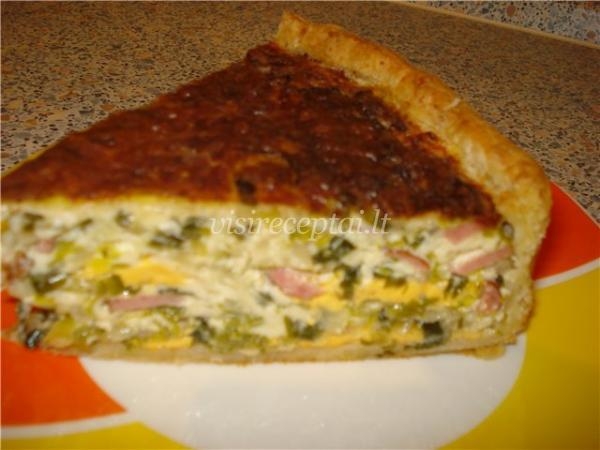 Į kepimo formą, išklotą tešla, sudekite daržoves, lydyto sūrelio gabaliukus bei dešreles ir užpilkite kiaušinių plakiniu.