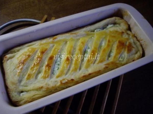 Sluoksniuotos tešlos lakštus iškočiokite. Vieną tešlos lakštą įtieskite į kepimo formą.