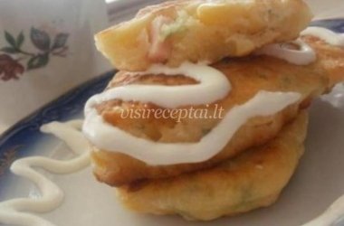 4. Įkaitiname keptuvėje aliejų ir pilame tešlos. Vienas didelis šaukštas tešlos, vienas blynas.
