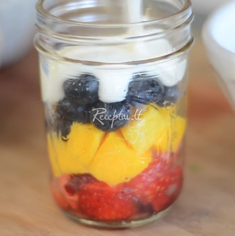 Į stiklines sluoksniuoti braškes, mangą, mėlynes. Užpilti jogurtu.