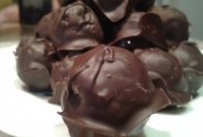 Dedam į šaldytuvą 1val. Galima valgyti ir be šokolado, bet aš išlydžiau juodąjį šokoladą (karšto vandens vonelėje) ir kiekvieną saldainį panardinau į jį. Dedam į šaldytuvą, kol šokoladas sustings.