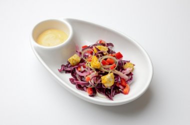 Vištienos krūtinėlę supjaustyti mažais gabaliukais ir pamarinuokite kaip esate įpratę. Paruoštus gabalėlius iškepti įkaitintame rapsų aliejuje, ir, atvėsintus, sudėti į salotas. Paskaninti majonezu su mangais.