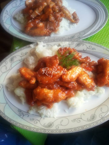 Vištieną apvoliojau kukurūzų krakmole ir apkepiau keptuvėje, padažui pakepinau morkas, dėjau 3 šaukštus pomidorų padažo, šaukštą cukraus ir šaukštą krakmolo, sumaišyto su pora šaukštų vandens.