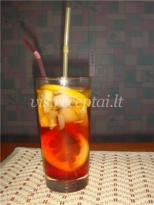 Į arbatą įmaišyti granatų sultis, įdėti citrinos griežinėlių ir ledukų.