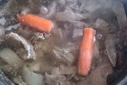 Nukaičiu, perplaunu ir dedu į puodą kartu su visais prieskoniais ir daržovėmis, druskos pagal skonį, pilu vandens ir verdu ant mažos ugnies apie 2 valandas.