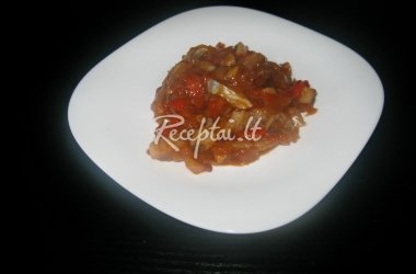 Svogūną ir papriką patroškinti aliejuje, supilti pomidorų padažą, suberti pipirus, pamaišyti, dar pakepinti, atšaldyti ir sumaišyti su silke.