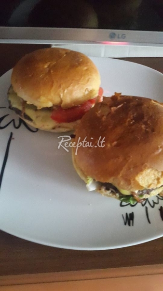 Tada sluoksniuojame- bandelė aptepta padažu, pjaustyta salota, Biovela jautienos mėsainis,kepinti svogūnai, marinuoto agurko griežinėlis, pomidoro griežinėlis ir vel bandelė.