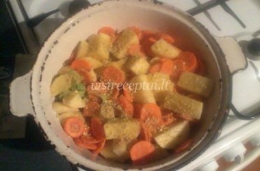 Lašišos gabalėlius pamarinuojame su citrina, pirpirais. Paskui dedame į puodą, pripjaustome bulvių, morką, poro. Užbarstome „Vegeta Natur“ prieskonių (atstoja sultinio kubelius), užpilame vandeniu ir troškiname ant silpnos ugnies, kol suminkštėja daržovės.