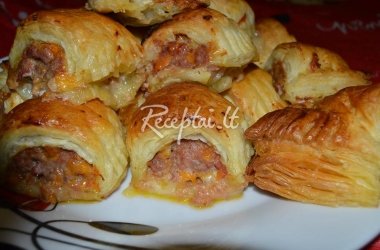 Tiesti tešlą, dėti įdarą ir susukti. Tada supjaustyti norimais gabaliukais ir kepti orkaitėje apie 10-15 min.