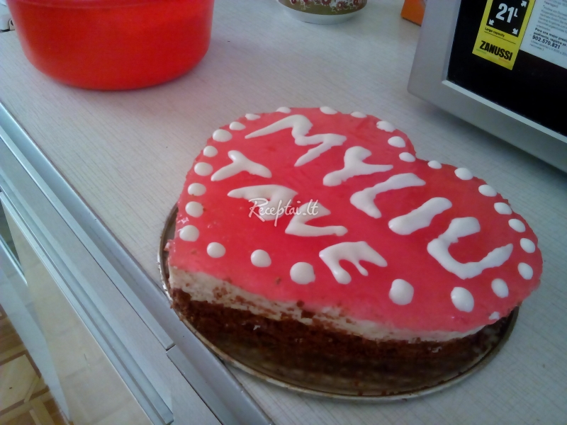 Tuomet sudedame Mascarponę ir vėl plakame, kol masė taps vienalytė.Želatiną užpilame 50 ml vandens ir pastatome 30 minučių išbrinkti.
