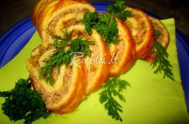 Kai sūrio pagrindas atvės, ant jo tolygiai po visą plotą užtepame mėsos įdarą ir susukame vyniotinį.