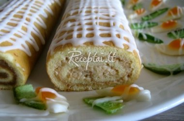 Ant stalo patiesti kitą kepimo popierių, pabarstyti cukraus pudros ir ant jo išversti biskvitą, popierių nuo viršaus nulupti. Biskvitą su visu popieriumi susukti, kad, kol ruošime įdarą, jis truputį vėstų ir laikytų vyniotinio formą.