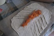 Tešlą daliname į 2 dalis. Imame vieną dalį tešlos ir iškočiojame ovalios formos lakštą. Dedame ant viršaus žuvies filė. Iš šonų įpjauname ~1,5 cm pločio juosteles, taip, kad galima būtų daryti pynimą. Ant filė dedame pagamintą morkų įdarą. Iš pradžių skersai vieną kitos sulenkiame tešlos gabalėlius, taip formuodami žuvies galvą. Tada, pynimo būdu, vieną paskui kitą lenkiame supjaustytas juosteles. Galiausiai suformuojame uodegą. Taip suformuojame abi žuvis ir dedame į kepimo popieriumi išklotą skardą. Sutepame kiaušinio tryniu ir pašauname į jau įkaitintą ( 180 °C ) orkaitę bei kepame ~ 40 min.
